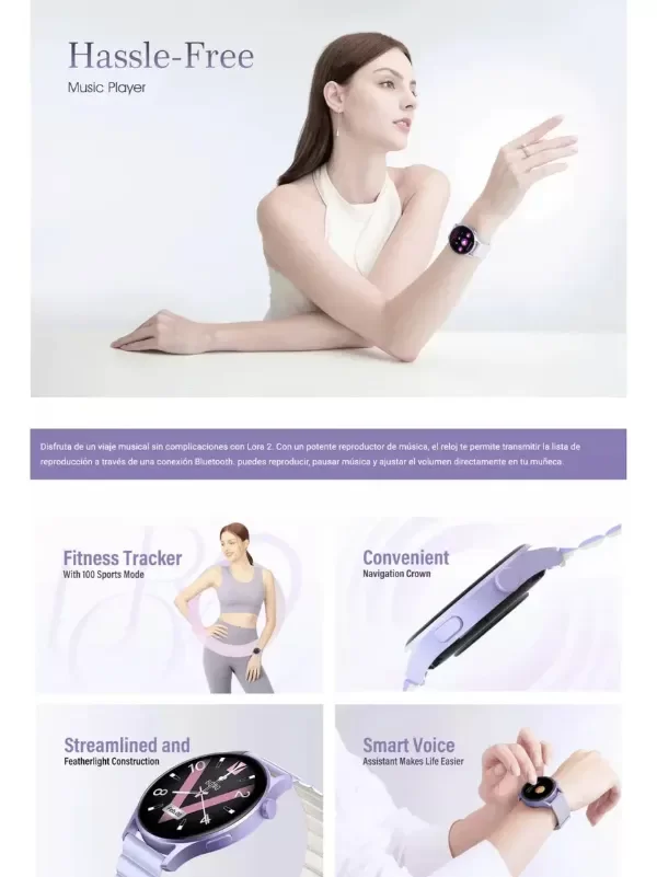 Además, el Lora 2 asegura llamadas Bluetooth fluidas y estables con una conexión BT5.2, permitiéndote recibir, rechazar y marcar llamadas con claridad cristalina. Su pantalla AMOLED refinada de 1.3 pulgadas ofrece imágenes brillantes y vibrantes, incluso bajo el sol, con la función Always-On Display (AOD) para un acceso rápido a la hora y el conteo de pasos.